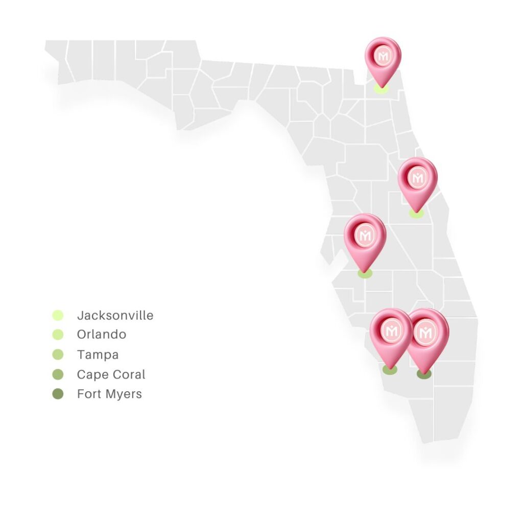 JACKSONVILLE: Saint Augustine, Ponte Vedra, and Saint Johns. TAMPA Area: St. Peterburg, Clearwater, Ana Maria Island and Bradenton.